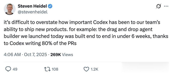 OpenAI研究员Steven Heidel在X上透露,最新发布的Agent Builder不到6周就完成了端到端构建,而Codex编写了80%的PR。