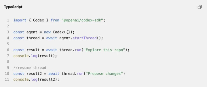 其次是Codex SDK,能把支持Codex CLI的智能体嵌入自己的工作流、工具和应用,借助几行代码,就能让GPT‑5-Codex发挥出色性能,而且SDK提供结构化输出和上下文管理,现在支持TypeScript,后续会有更多语言支持,同时还有新的GitHub Action,方便集成到CI/CD管道,在shell环境也能通过命令行使用Codex智能体。