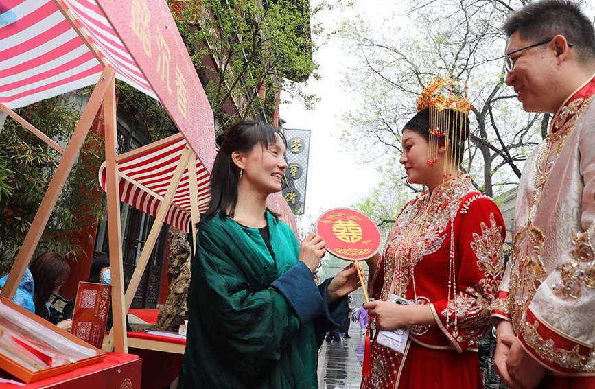 “椿庭囍市——2026年甜蜜经济市集”以传统婚俗文化为核心,融合非遗文化体验与现代互动形式,打造以浪漫、甜蜜为主题的市集活动。活动涉及50家企业,如菜百首饰、荣宝斋、一得阁等,分别为“婚纱、婚俗、旅游、服务、衣食”五大类,设置1条甜蜜集章打卡路线、7处拍照打卡点、2个互动游戏区、2个非遗体验项目。颇具特色的是,菜百首饰携多款婚庆主题饰品亮相,以传统工艺传递东方婚恋美学,为市集增添一抹典雅的金色浪漫。